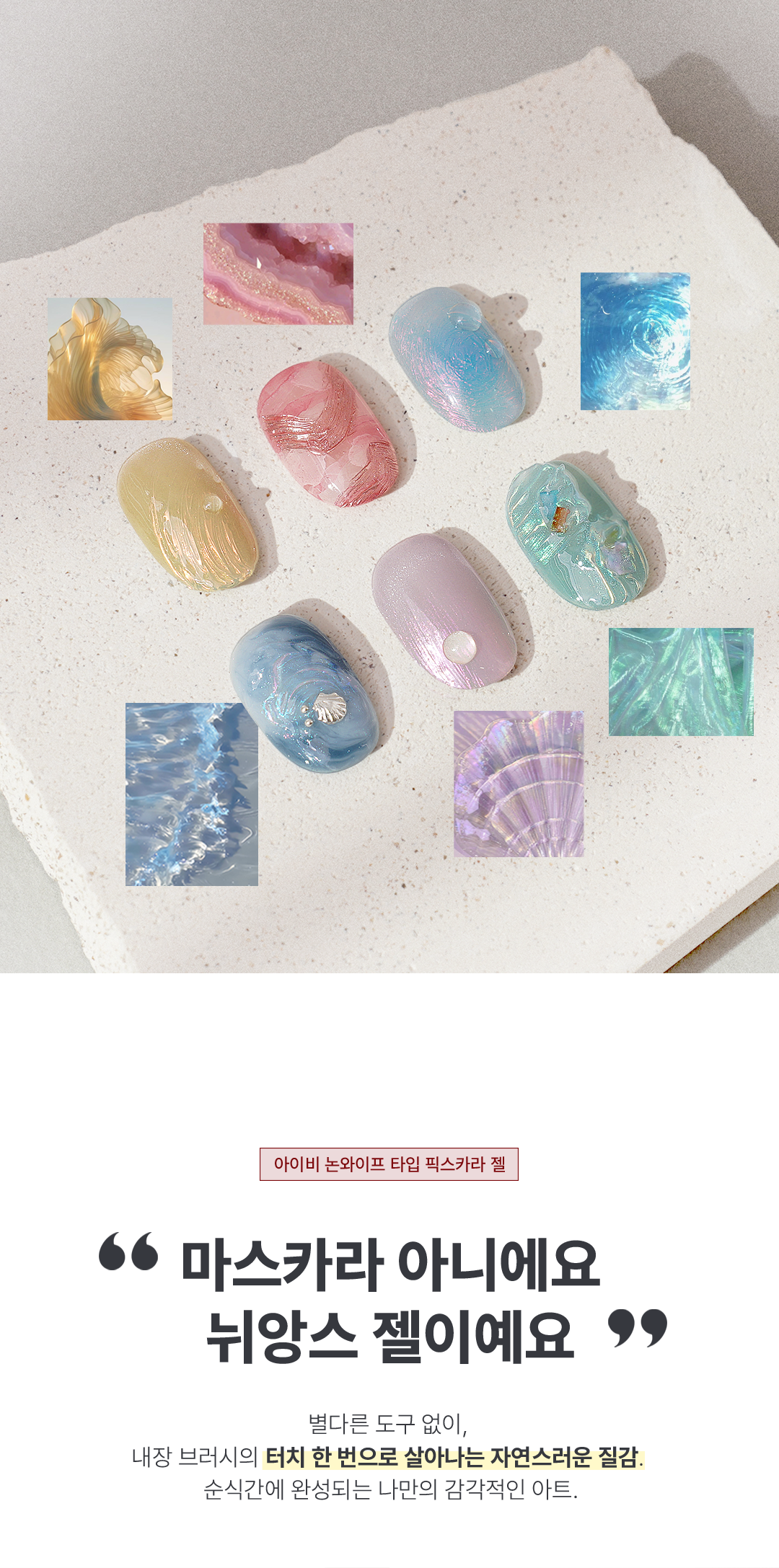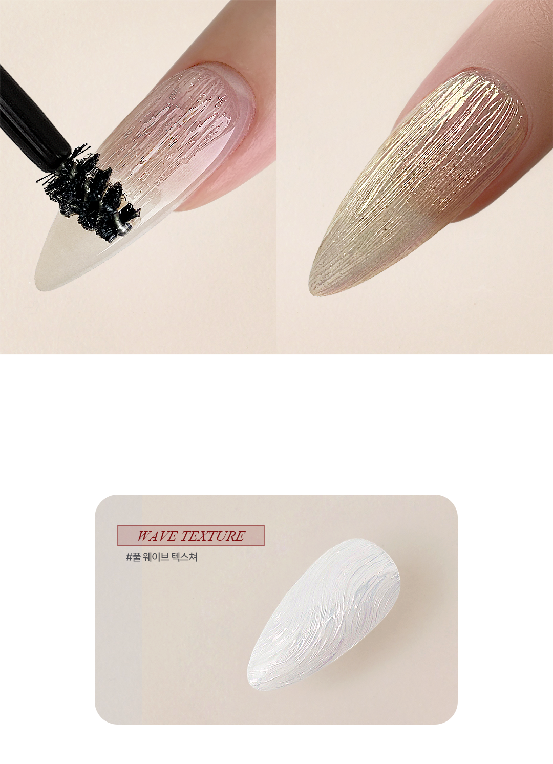 사용: 내장 브러시로 결을 살려 도포 후 즉시 파우더 아트 가능 (LED/48W 60초 큐어링)